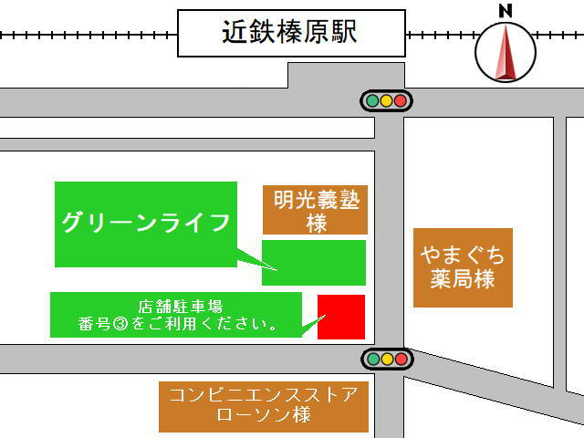 周辺地図 店舗名 グリーンライフ 所在地 〒633-0253 奈良県宇陀市榛原萩原151-2 ※近鉄榛原駅南口から徒歩約1分にございます。お隣は明光義塾様 お向かいはやまぐち薬局様でございます。 電話 FAX 0745-96-9296 営業時間 AM 10:00 ~ PM 7:00 定休日:日曜 駐車場 店舗南側にございます。